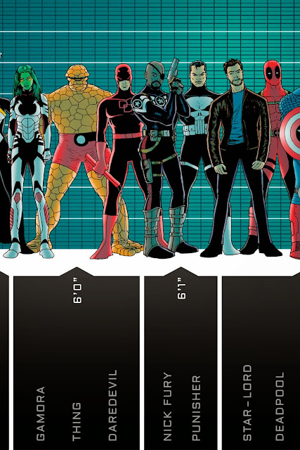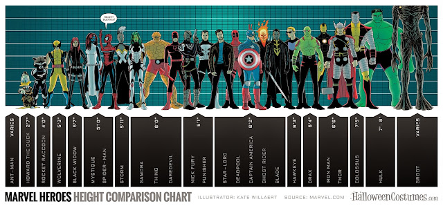 Chances are, if you clicked on this post, then you know a thing or two about superheroes. It's probably safe to assume that you're hip to some basic trivia about the most popular cartoon crimefighters. You know...things like their origin stories, classic costumes, catchphrases, famous nemeses, etc. But have you ever noticed that our knowledge in one basic area of superhero factoids "comes up short?" That's right: Height. How TALL are these guys?! Is Spidey a munchkin compared to Captain America? Could you wear heels on a date with Thor? Would Rocket Raccoon and Howard the Duck stand eye to eye?